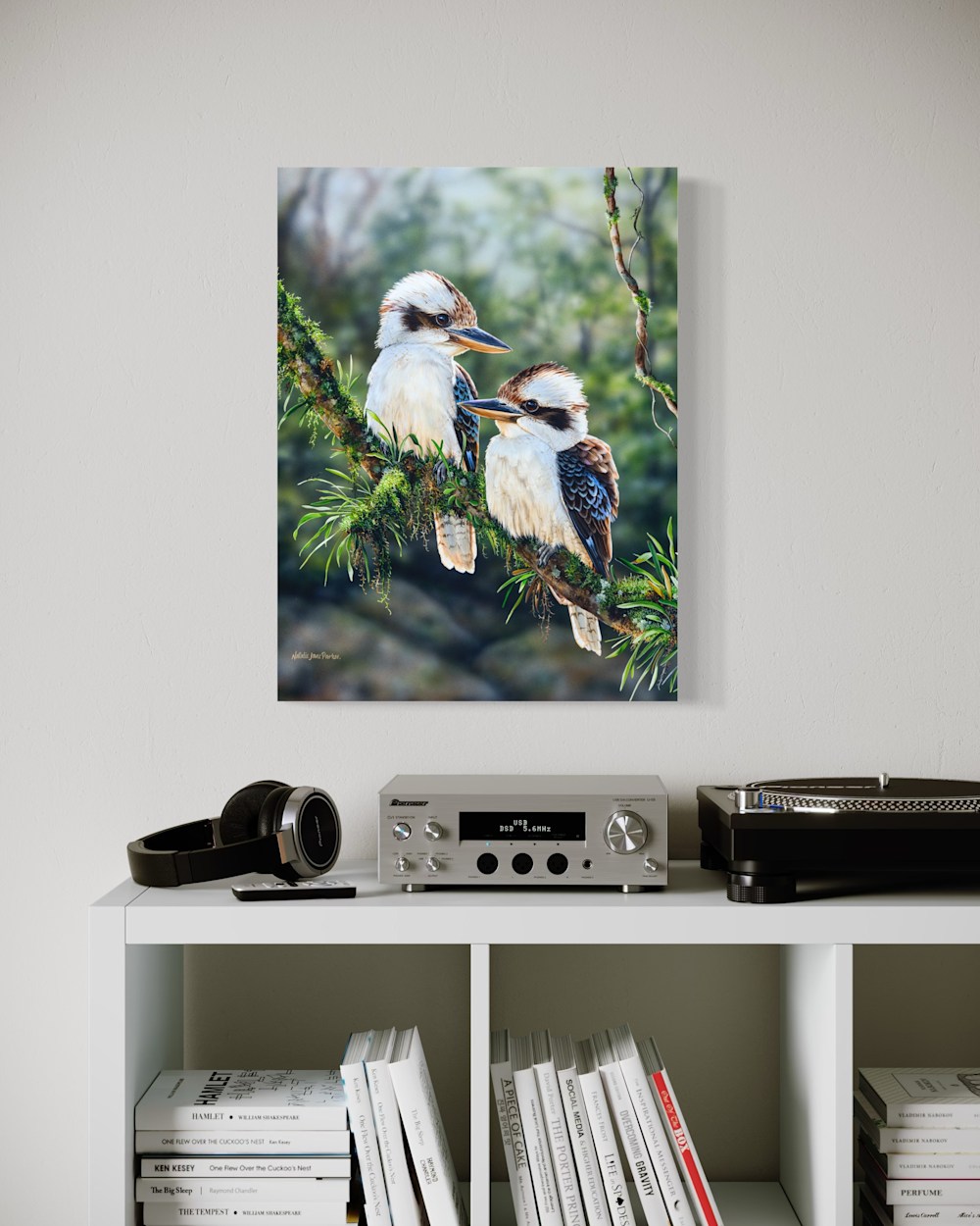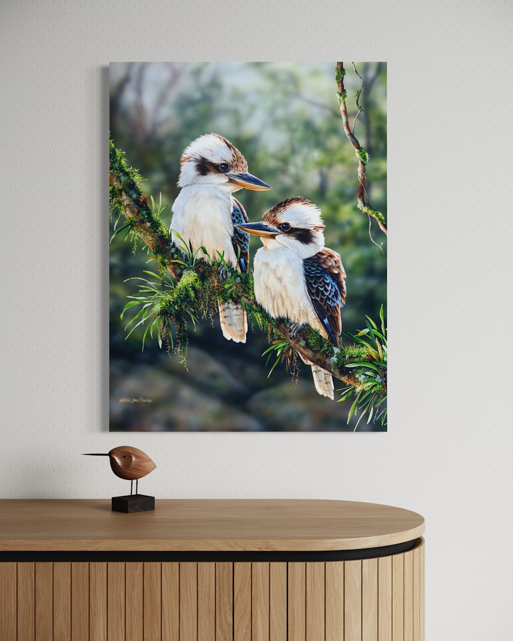 Immerse yourself in the mesmerising charm of Australia's kookaburras in the artwork "Rainforest Glow”, by acclaimed wildlife artist Natalie Jane Parker that has gained global recognition for its beauty and artistic excellence. Explore the intricacies of this masterpiece that has earned accolades and acclaim in the realm of wildlife artistry. A gem, for enthusiasts of both art and nature!
