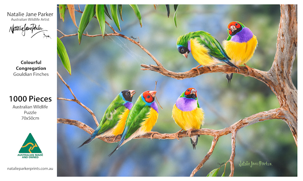 Bring a burst of colour to your table with Natalie Jane Parker’s Colourful Congregation—a vibrant portrait of Gouldian Finches (Erythrura gouldiae). A satisfying 1000-piece challenge with a stunning 50 × 70 cm finish, proudly Australian-made.