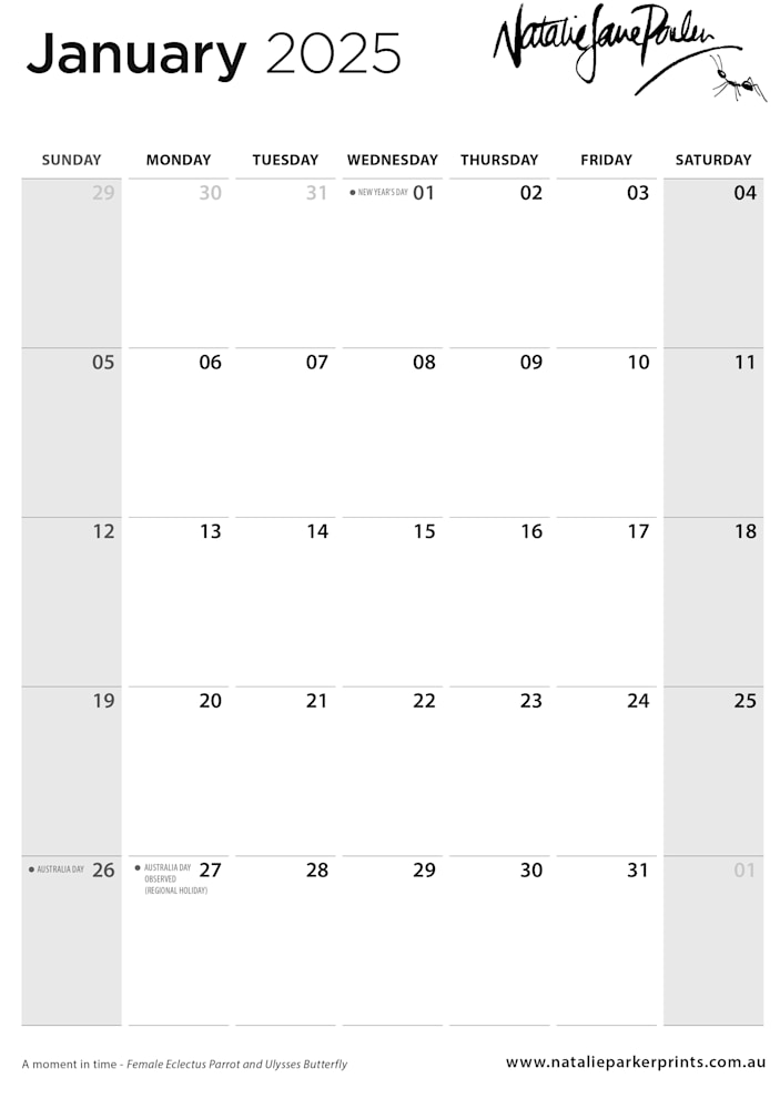 Each calendar includes 12 of Natalie's artworks, featuring favourite Australian birds or wildlife.