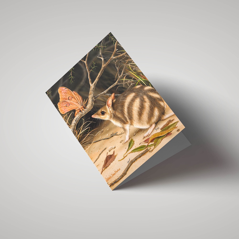 Single Greeting Cards featuring "Unexpected Friends" featuring a Eastern Barred Bandicoot and Emperor Gum Moth