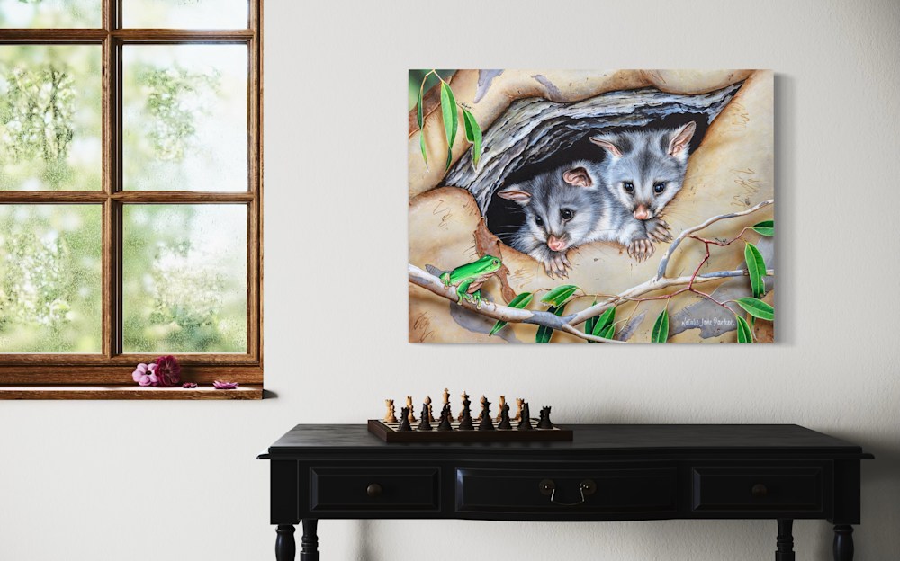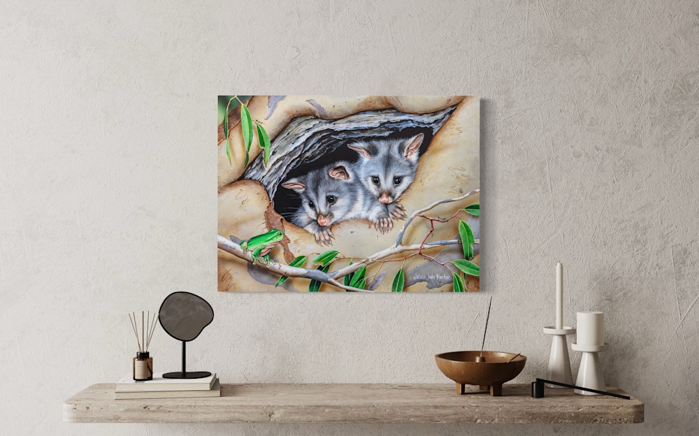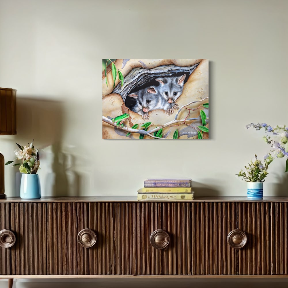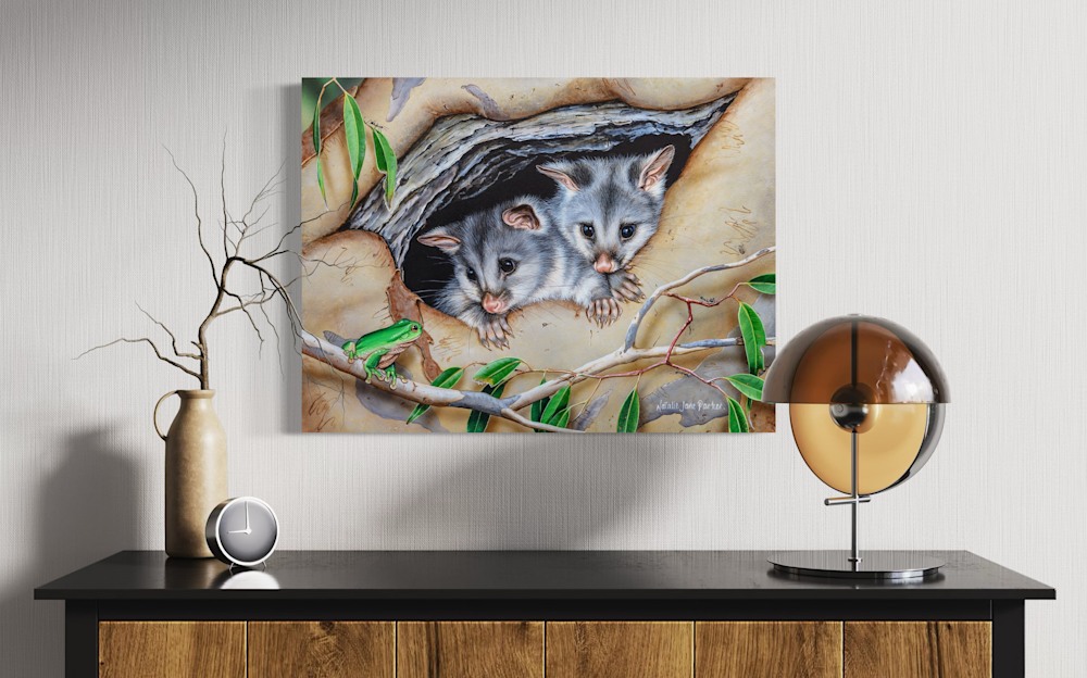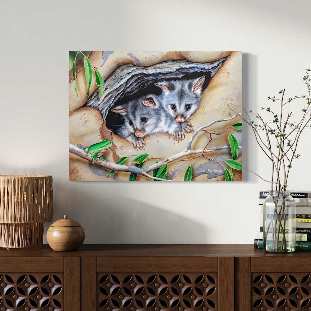 Immerse yourself in the heart of Australia with Natalie Jane Parker's exquisite "Cosy Home" canvas print, showcasing iconic Common Brushtail Possums (Trichosurus vulpecula) with a Green Tree Frog (Litoria caerulea) amidst a vibrant Australian background. This is more than just artwork; it's a window into the wild stories and adventures of these beloved creatures.