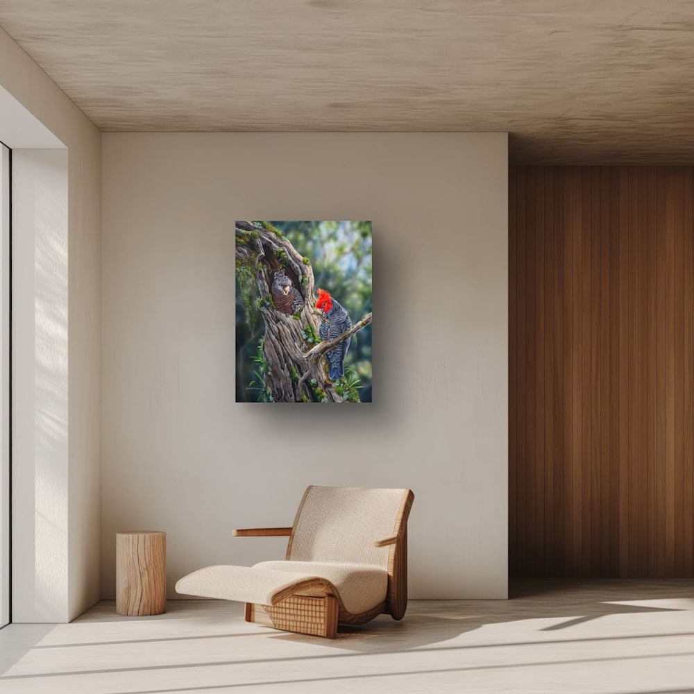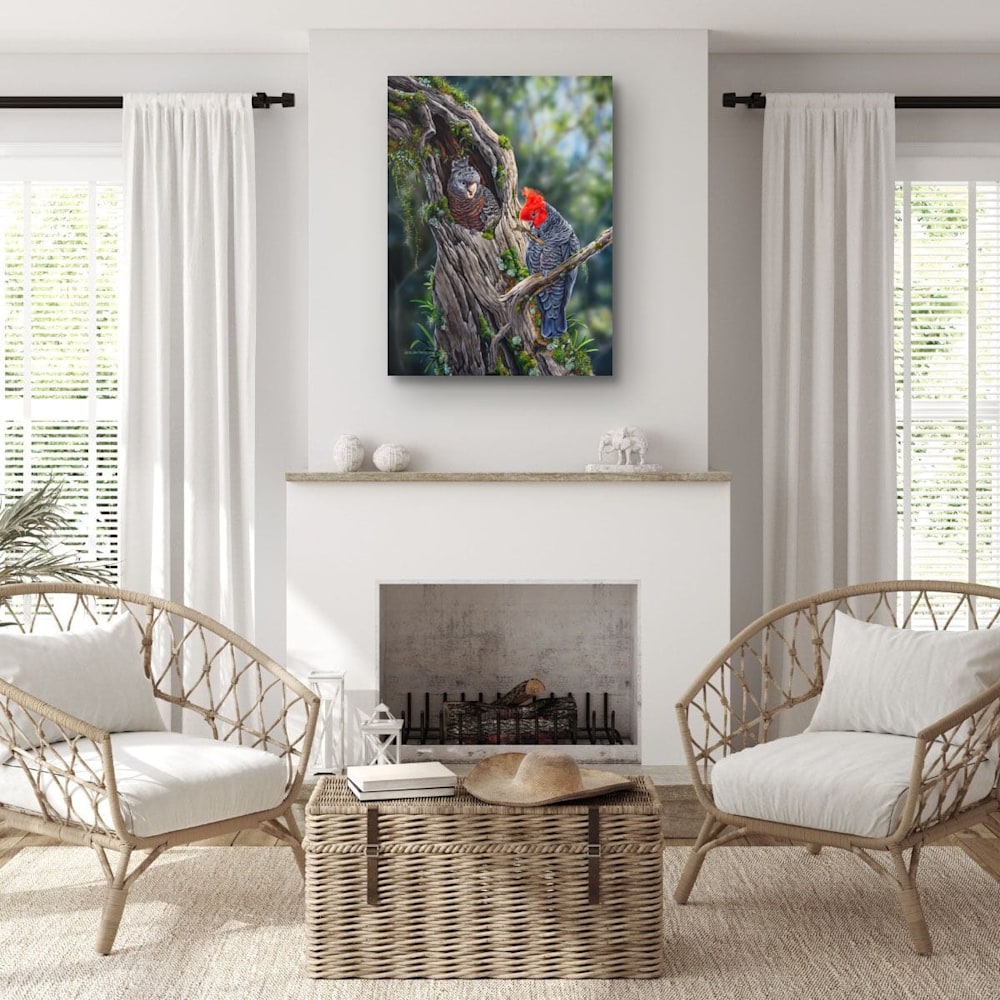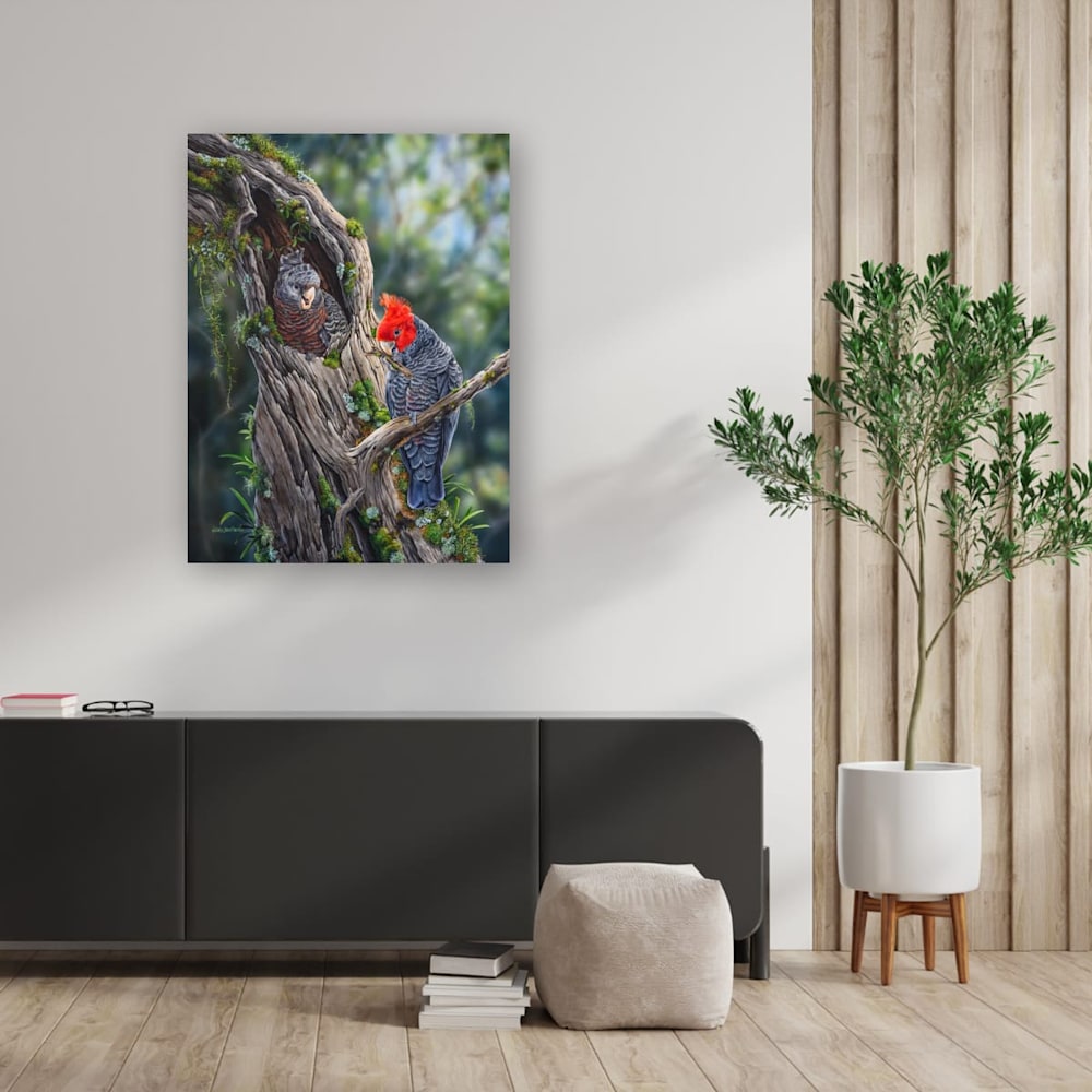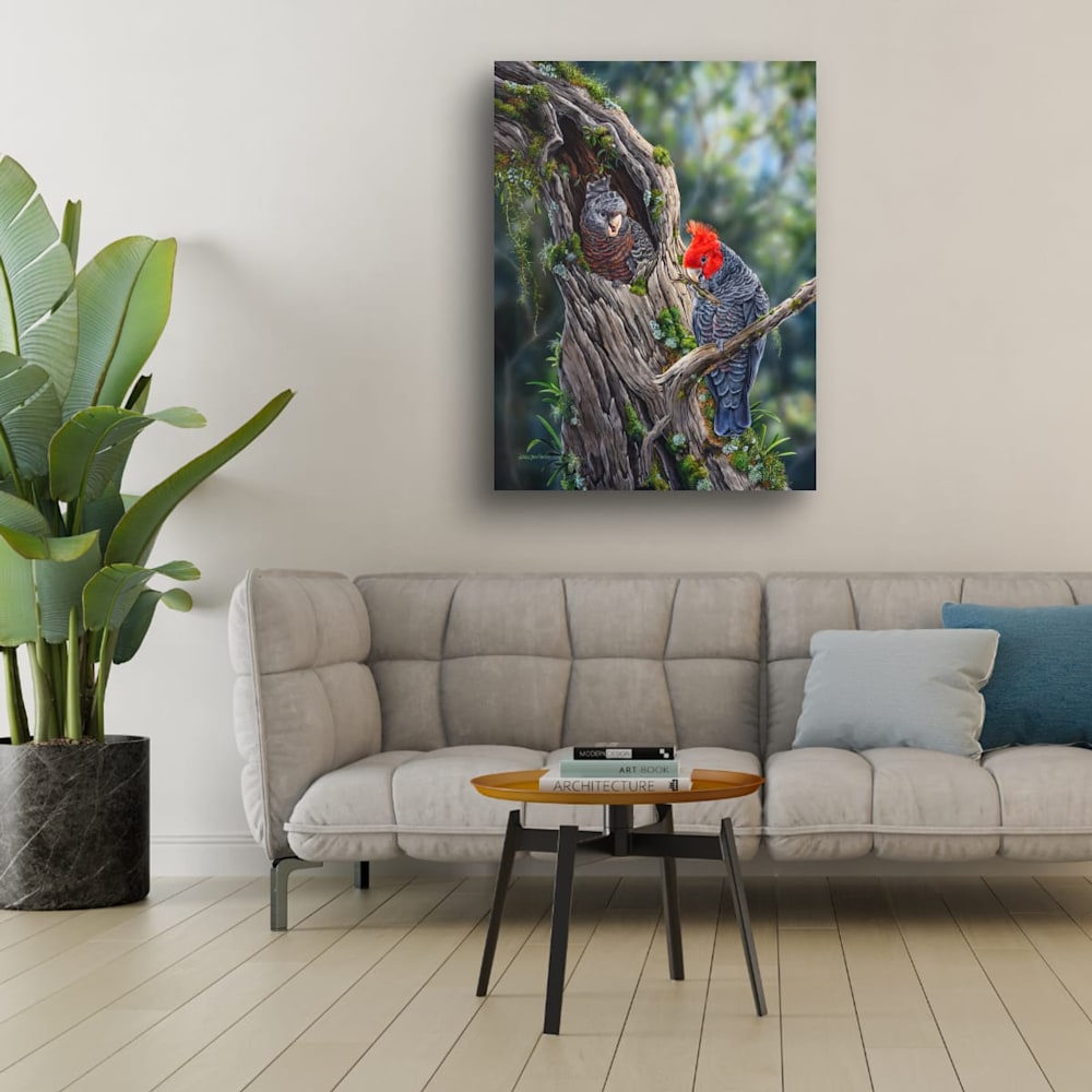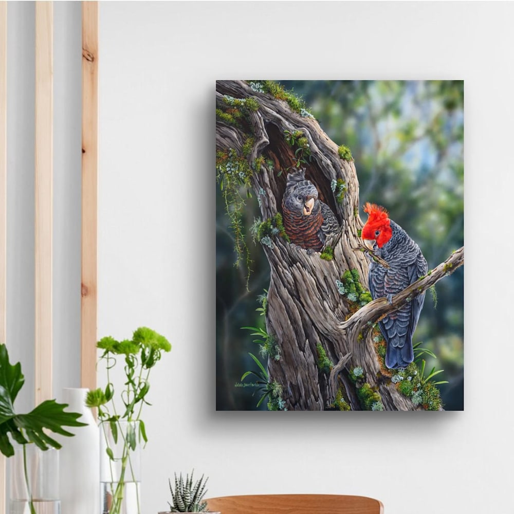 Each print showcases Natalie’s richly detailed portrait of a pair of Gang-gang Cockatoos busily tending to their home. From the delicate textures of their plumage to the soft forest background, every brushstroke captures the warmth, personality and partnership of these endearing Australian birds.