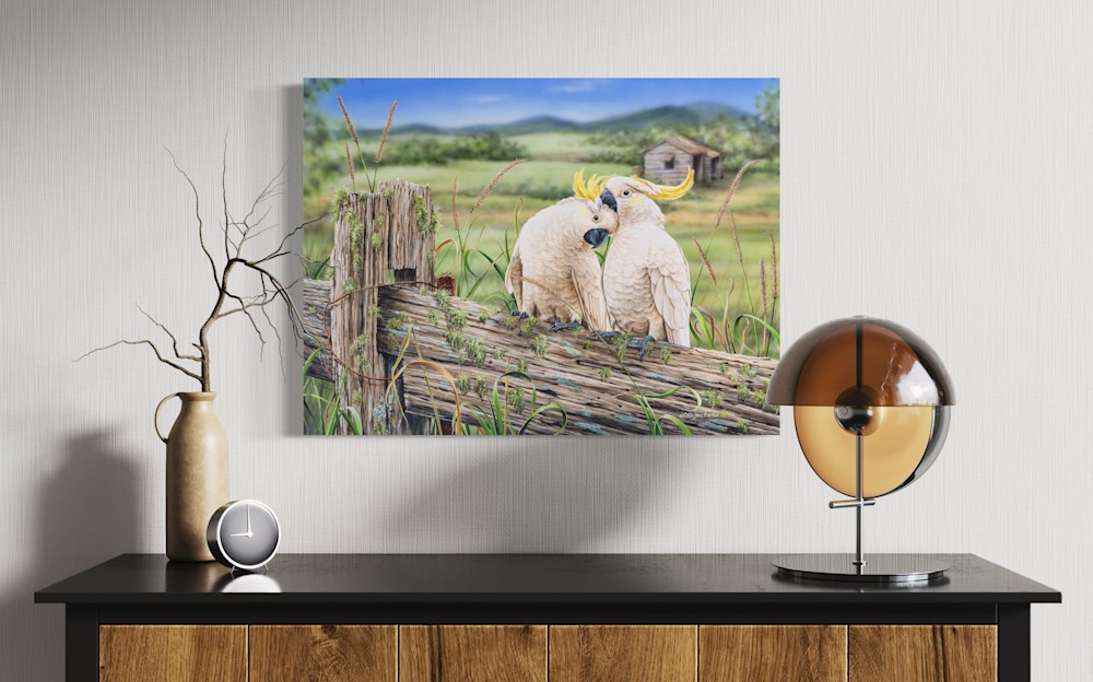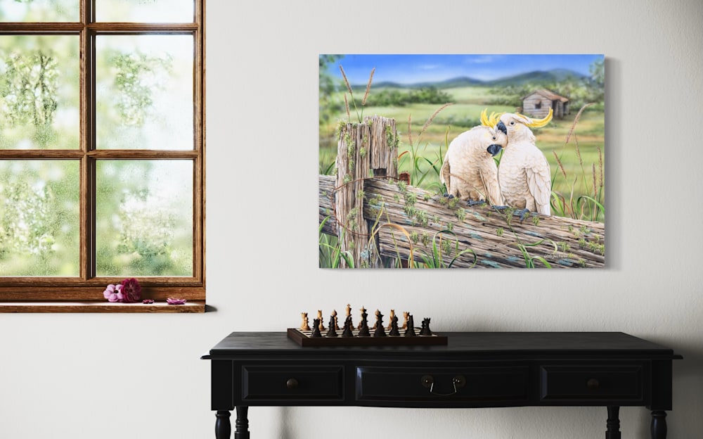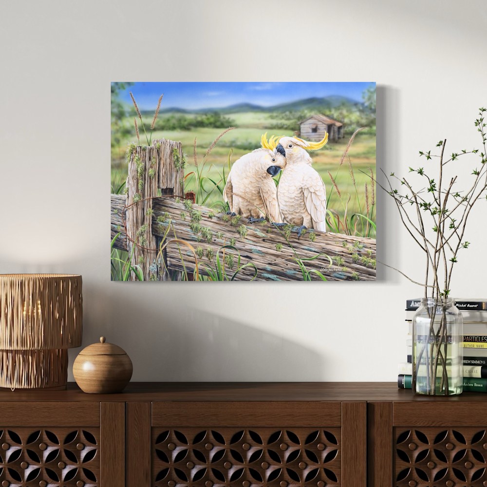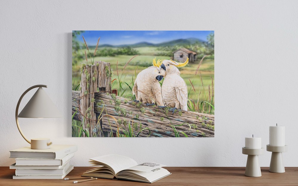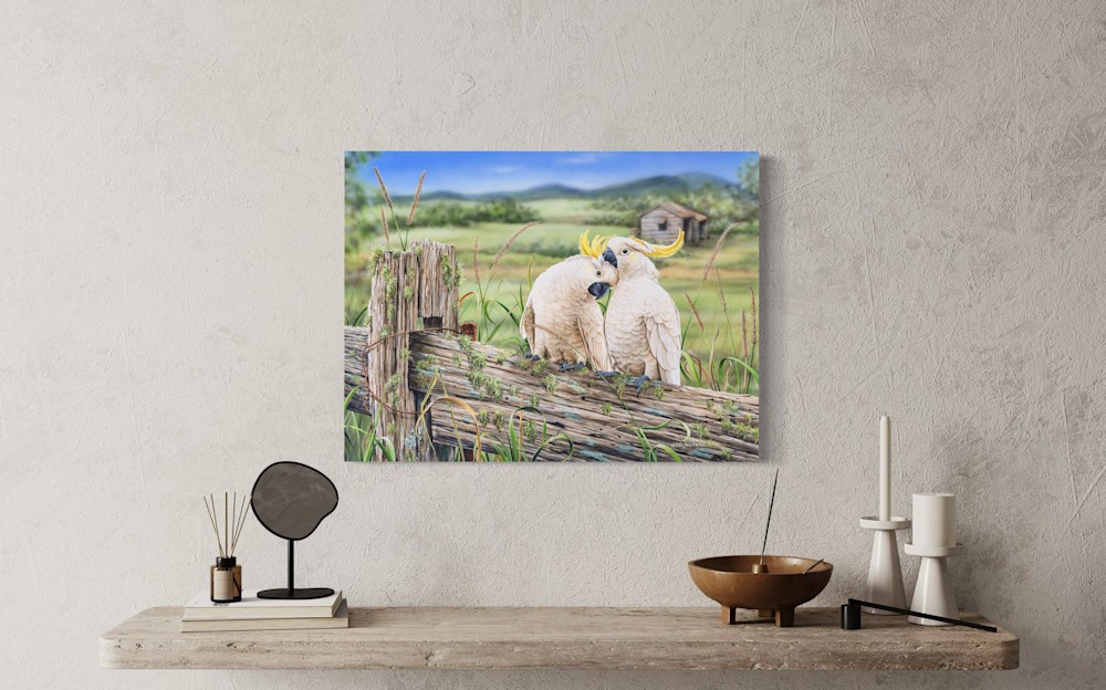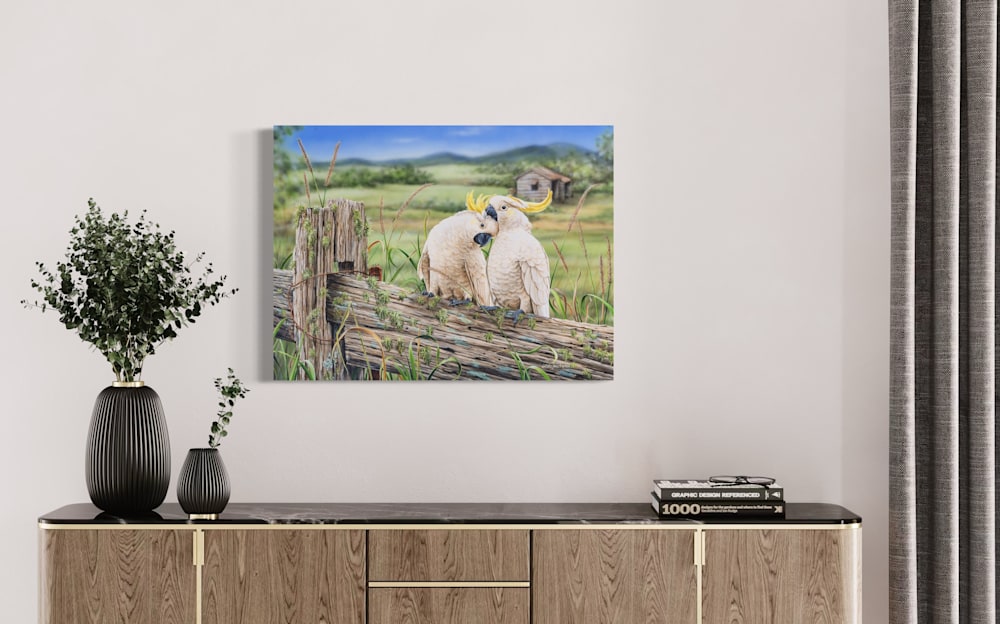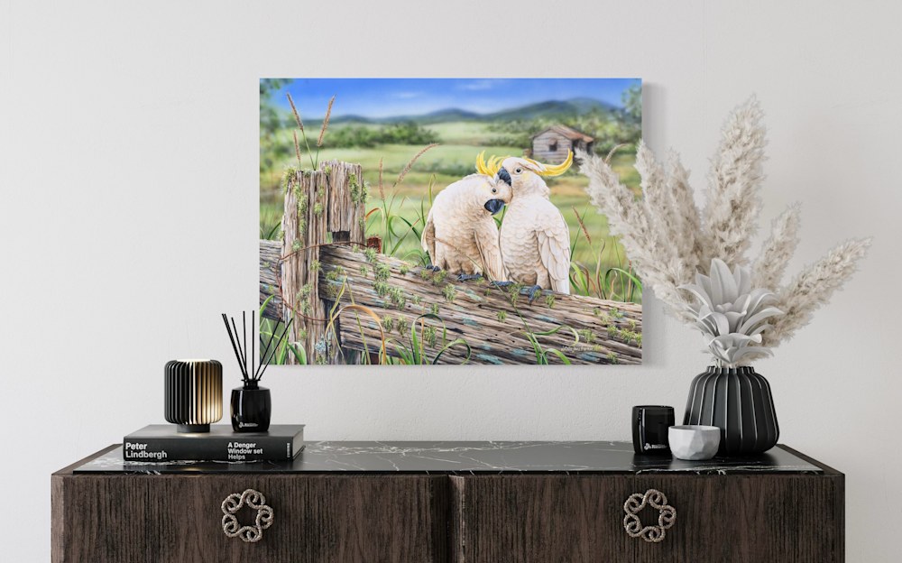 Immerse yourself in the heart of Australia with Natalie Jane Parker's exquisite "Countryside Retreat" canvas print, showcasing iconic Sulphur-crested Cockatoo s(Cacatua galerita) amidst a vibrant Australian background. This is more than just artwork; it's a window into the wild stories and adventures of these beloved creatures.
