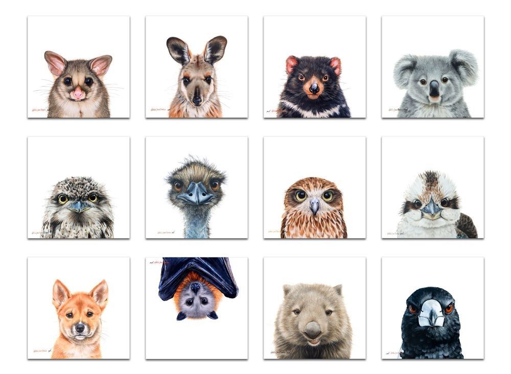 This set includes one each of the prints. This includes Laughing Kookaburra (Dacelo novaeguineae), Emu (Dromaius novaehollandiae), Tawny Frogmouth (Podargus strigoides), Boobook Owl (Ninox boobook), Tasmanian Devil (Sarcophilus harrisii), Common brushtail possum (Trichosurus vulpecula), Yellow-footed rock-wallaby (Petrogale xanthopus), Koala (Phascolarctos cinereus), Bare-nosed Wombat (Vombatus ursinus), Grey-headed flying fox (Pteropus poliocephalus), Australian Magpie (Gymnorhina tibicen) and Dingo (Canis familiaris)