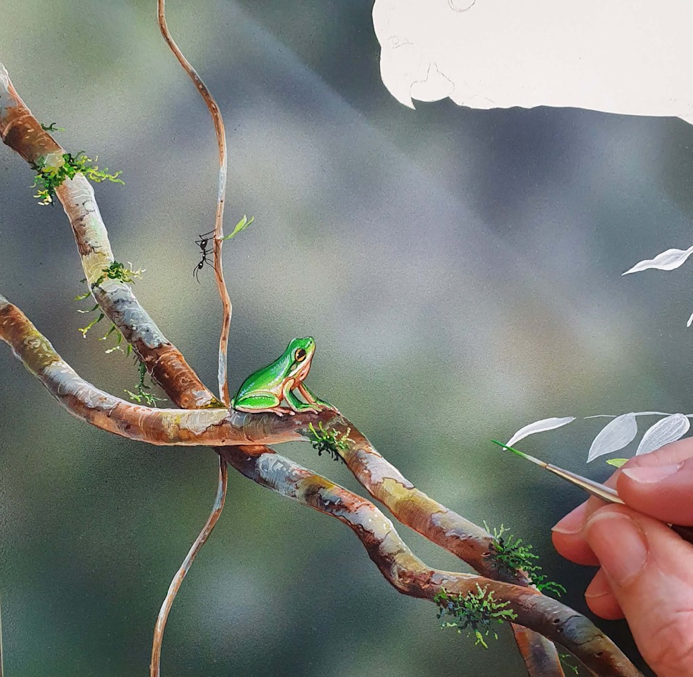 Now for the detail work. I decided to begin on the right-hand side, focusing on the vines and the Eastern Dwarf Tree Frog. Frogs are always a favourite to paint — there's something about their texture and those wonderful eyes. And I couldn't resist adding a couple of ants on the vine. But I don't like even numbers when it comes to ants in my artworks — so there would be one more added before this painting was finished. Stay tuned.
