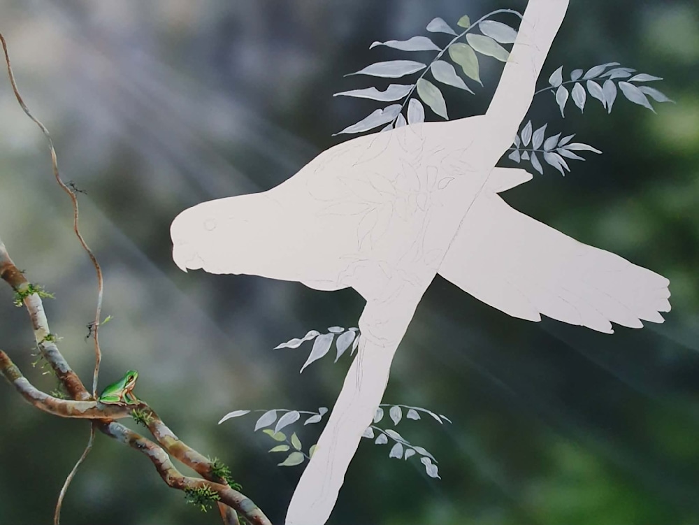 Once I've masked out the bird, branch, and frog, I airbrush the background. A general rule I work by is painting from the background forward — always building in layers.