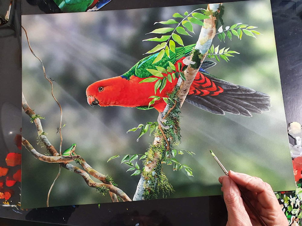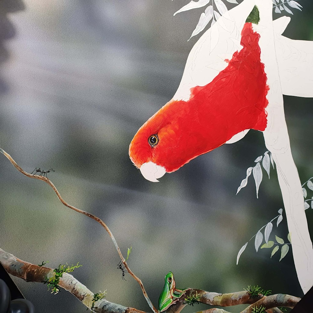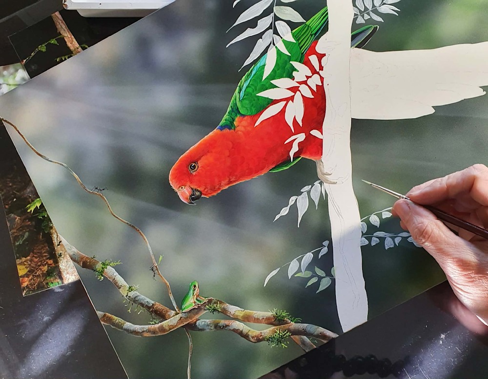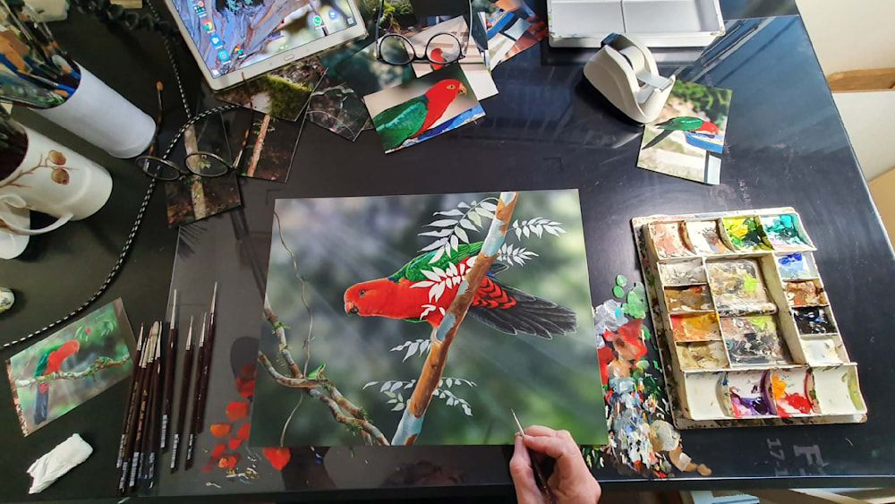A theme I enjoy is creating interactive scenes between two completely different species. So in this painting, accompanying the King Parrot is a tiny Eastern Dwarf Tree Frog — another resident of my garden, and one of my favourite subjects to paint.