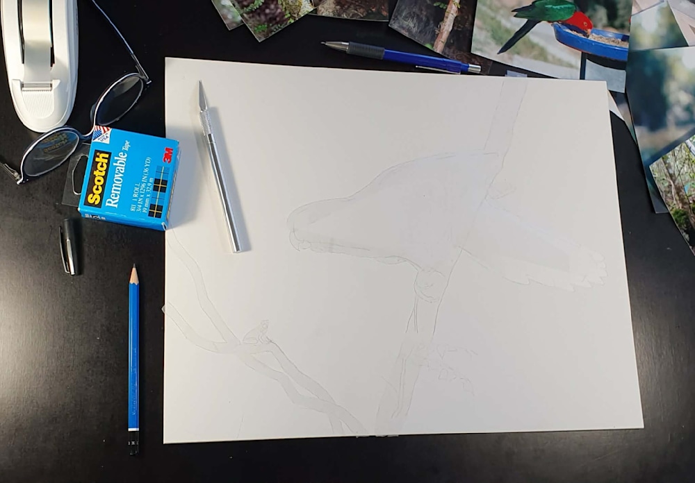 After settling on my reference photos, I sketch the composition onto paper, fine-tuning the subjects until I'm happy with the format. I then trace the outline onto my Claybord.